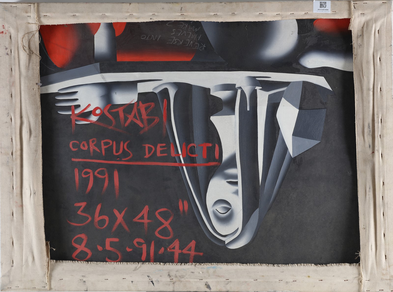 KOSTABI MARK (n. 1960) Corpus Delicti. 1991. Olio su tela. Cm 123,00 x 92,00. Firma e anno in basso a sinistra. Al retro titolo firma e anno. Presente un altro dipinto sul retro della tela. Certificato di autenticità a cura dell'artista datata 20/3/92.