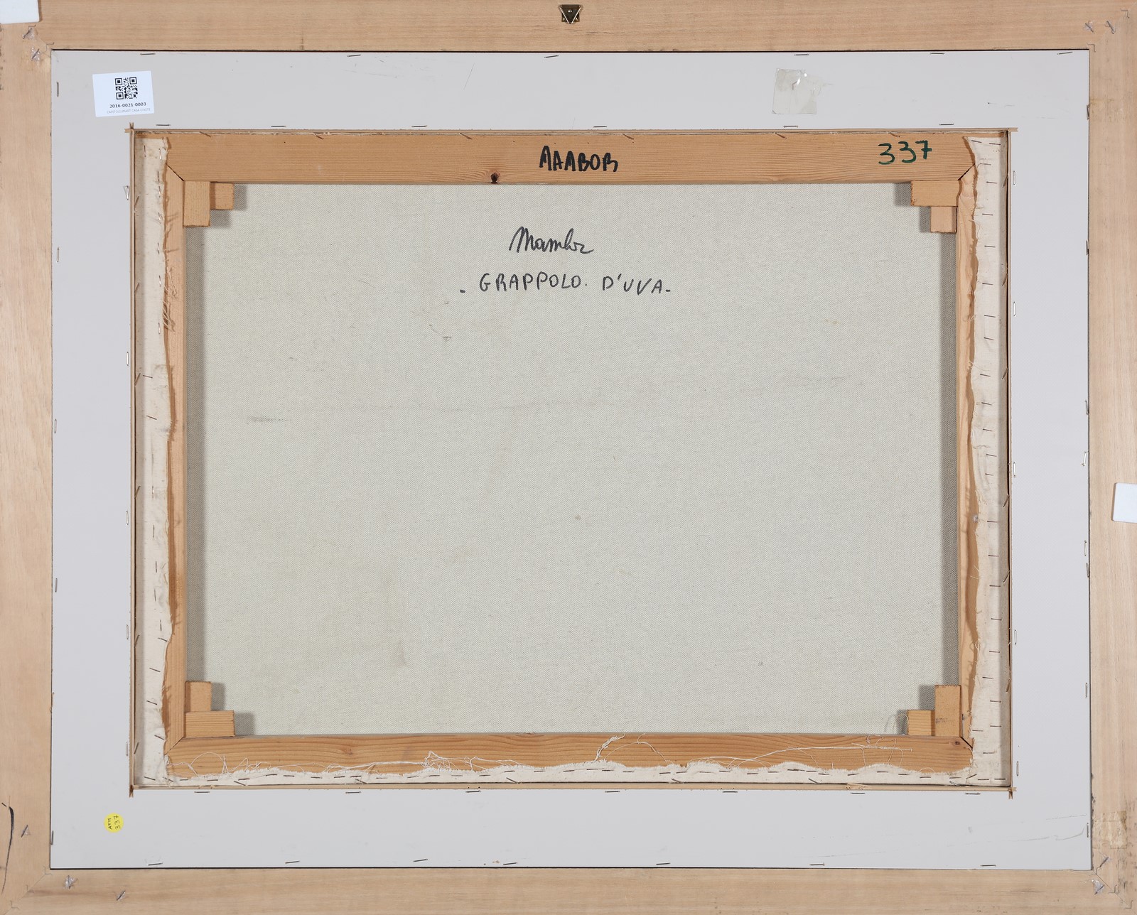 MAMBOR RENATO (n. 1936) Grappolo d'uva. 1963. Olio su tela . Cm 80,00 x 60,00. Firma in basso a sinistra. Al retro titolo e firma. Autentica dell'artista e timbro della galleria Art TIme, Brescia, su fotografia. . Cornice presente
