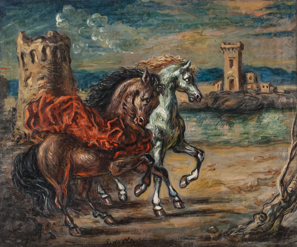 Vi è un legame particolare tra l’uomo ed il luogo dove nasce e cresce e il ricordo di ciò rimane dentro insieme a tutto quello che lo ha circondato durante i primi anni di vita. Giorgio De Chirico nasce a Volos, in Grecia, il 10 luglio 1888; cresce in Tessaglia e da piccolo gioca sulle rive di quel mare da dove gli Argonauti intrapresero il loro viaggio; trascorre la sua infanzia alle pendici del monte Pelio, terra d’origine dei Centauri, nonché dimora estiva degli Dei dell’Olimpo. Ipnotizzato dalla presenza dei centauri nella sua infanzia, De Chirico fece dei cavalli un tema molto ricorrente nelle suo opere pittoriche e dipinti come 'Le rive della Tessaglia' , 'Divini cavalli di Achille', 'Cavallo bucefalo' sono alcuni esempi di questo amore dell’artista per gli equini. Ma le radici dell’arte di De Chirico affondano anche in altri terreni tanto da continuare a giocare con la mitologia, riempiendo i suoi quadri di colonne in frantumi, figure plastiche con personaggi mitologici, dei, statue e luce.