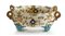 Centrotavola in maiolica smaltata e decorata con fiori e fogliame e piedi a testa di caprone e manici a forma di serpenti