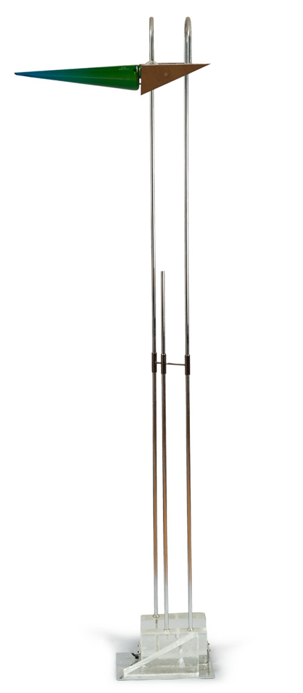 con diffusore in vetro verde sfumato azzurro ed elemento triangolare in acciaio, struttura in acciaio con tre elementi in vetro a decorazione della base.