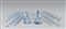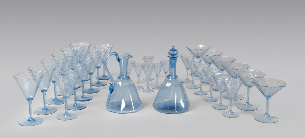 a fondo azzurro, con inclusioni a bollicine e vasca poligonale lobata. Composto da sei bicchieri da acqua, sei bicchieri da vino, sei bicchieri da spumante, sei bicchieri da liquore, sei bicchieri da rosolio e due bottiglie. Totale 32 pezzi.