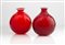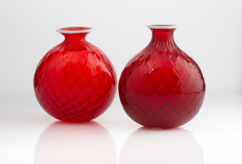 Coppia di vasi in vetro di murano rosso realizzati con tecnica della lavorazione a Balloton, con filo riportato a caldo sulla parte superiore in bianco
