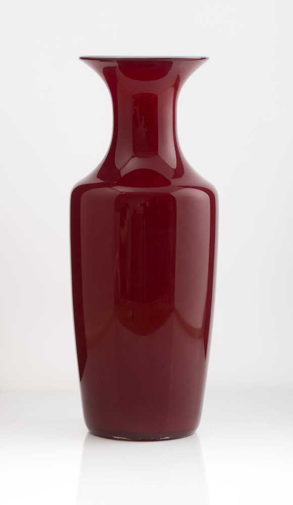 VASO OPALINO VENINI, 1986 Grande vaso in vetro soffiato rosso lavorato con la...