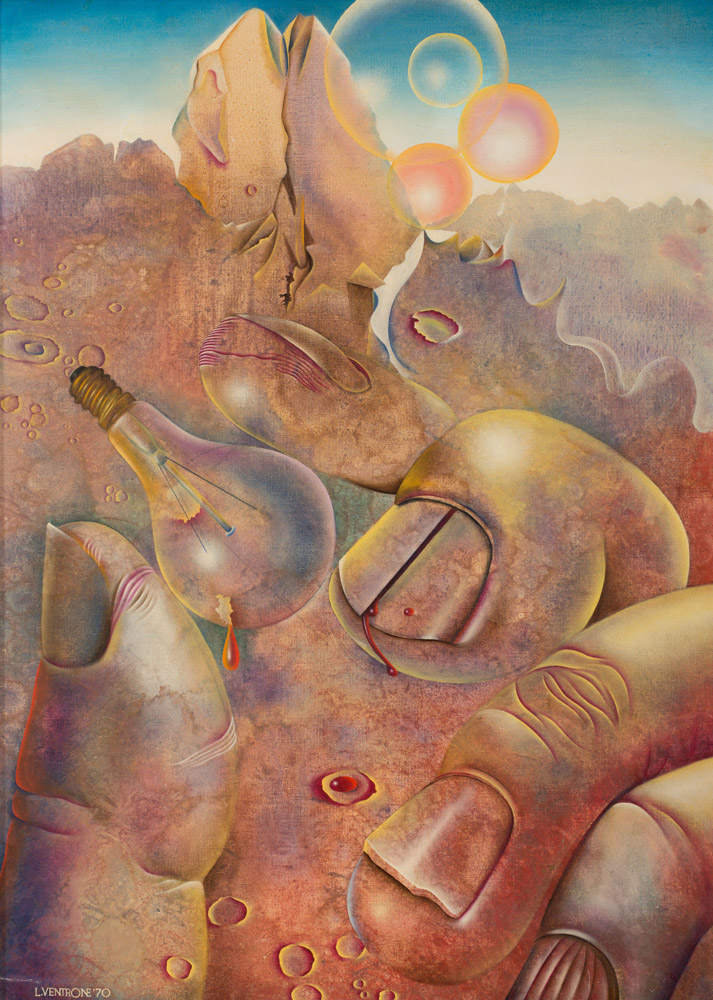 LUCIANO VENTRONE (Roma 1942) Composizione con mano e lampadina, 1970 Olio su...