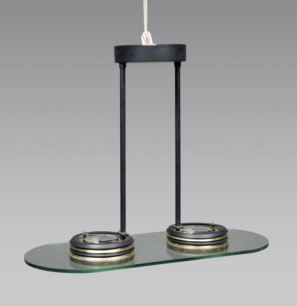 LAMPADARIO IN METALLO E VETRO, ANNI '70 a due punti luce, con mensola ovale...