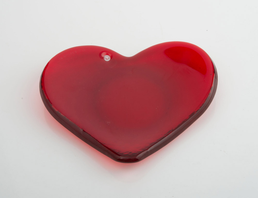 Svuotatasche a forma di cuore in vetro di murano rosso, timbro a fuoco e all'acido sul fronte.