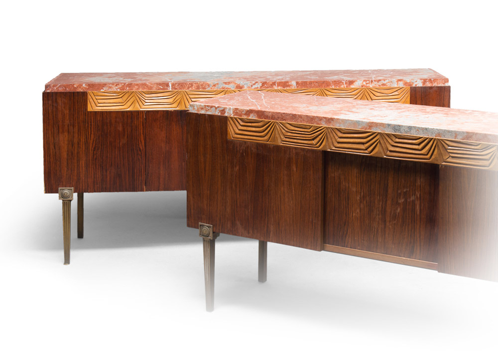 con piani in breccia rossa e fascaia del fronte in acero a motivi geometrici. Due sportelli a scomparsa, gambe in ghisa argentata.