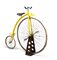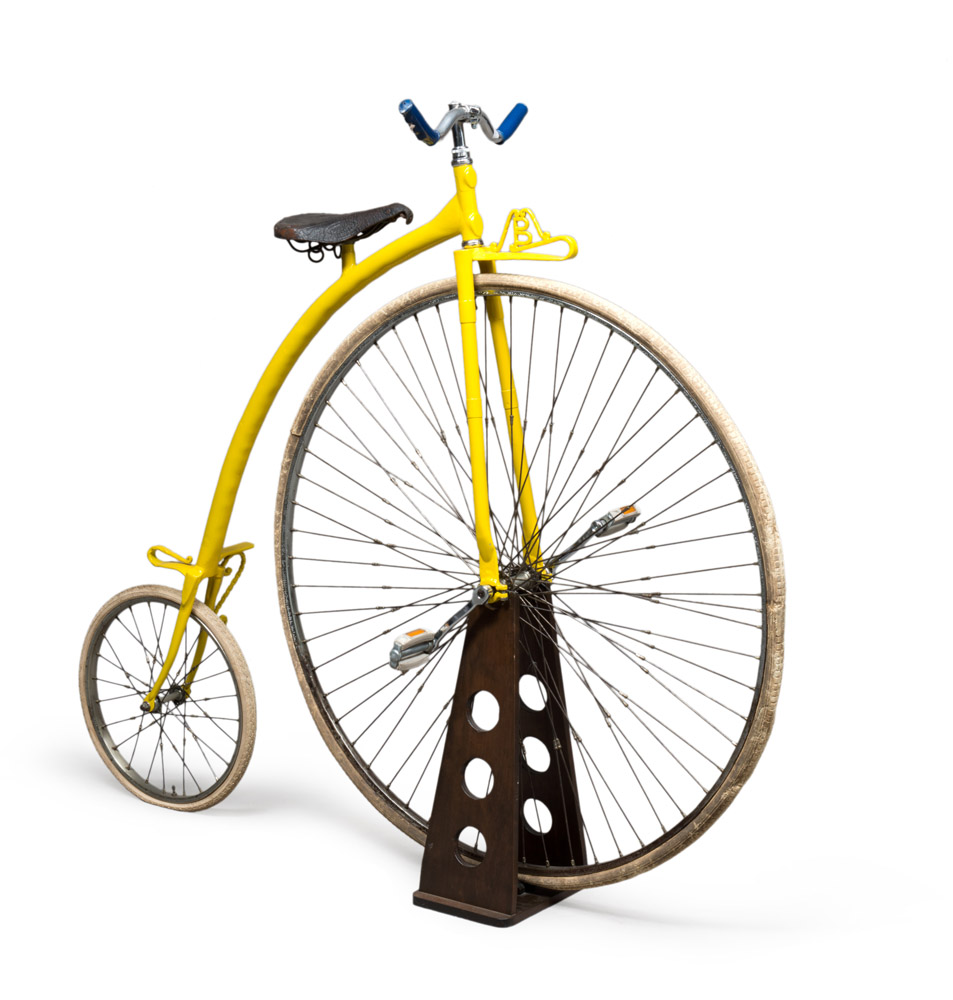 a lacca gialla, a grande ruota anteriore con manubrio e pedali recenti.