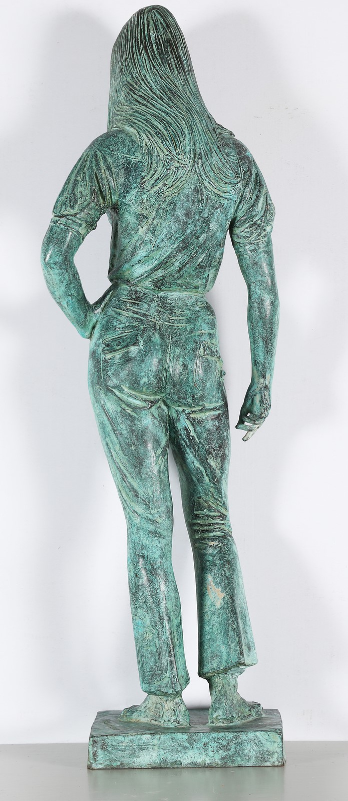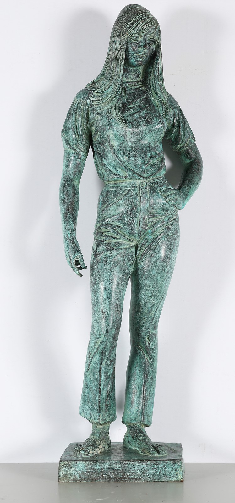 MESSINA FRANCESCO (1900 - 1995) Blue jeans girl. 1967. Bronze with green patina. Cm 70,00. Signed at the base. Artist's authenticity certificate. We are gratefull to the Messina Foundation for confirming the authenticity of the work.