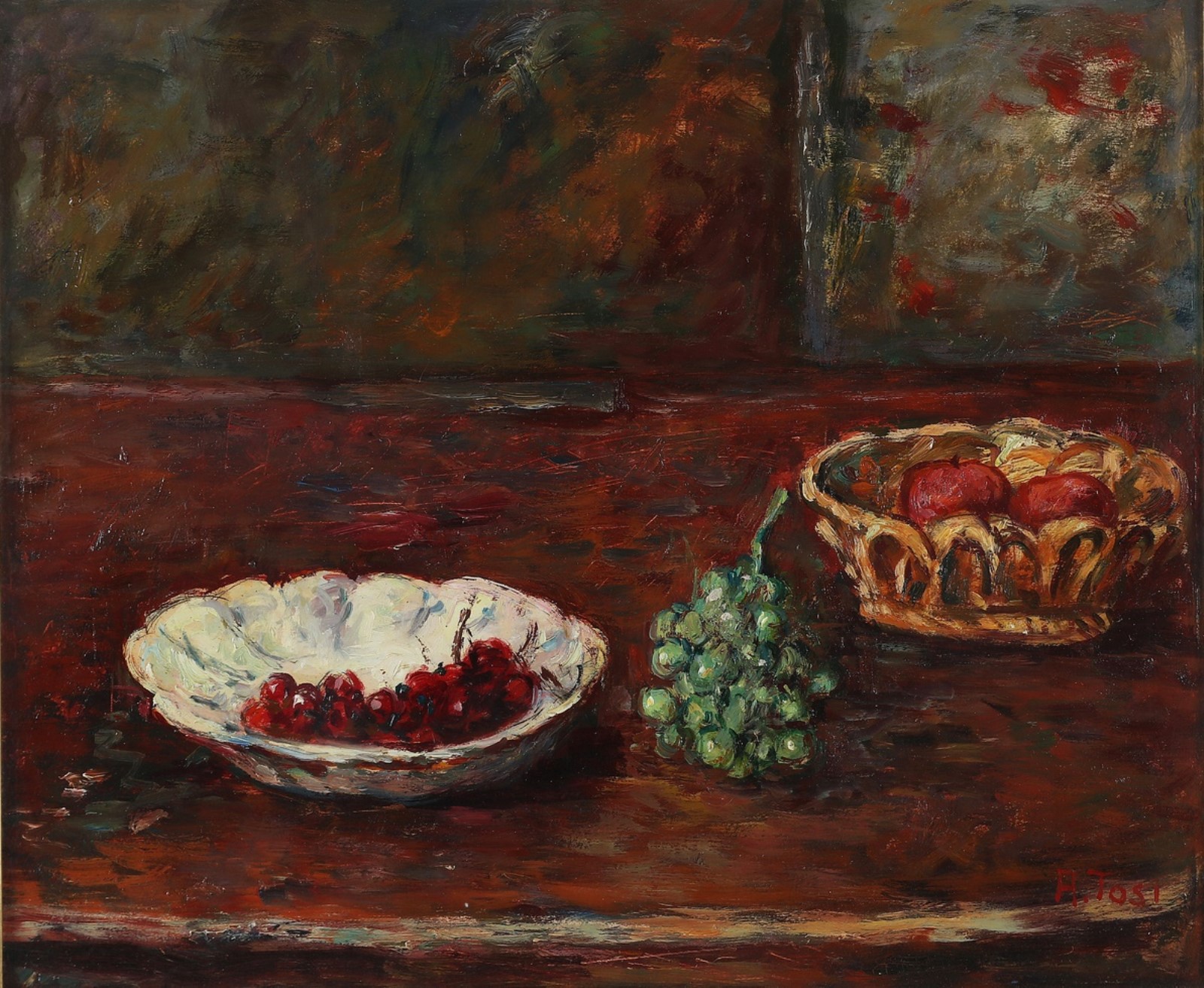 TOSI ARTURO (1871 - 1956) Still life. Oil on board. Cm 70,00 x 60,00. SIgned lower right. Centro D'Arte Dolomiti, Cortina D'Ampezzo, label at the back. Archivio Tosi, Milan, authenticity certificate on photo. Cornice presente