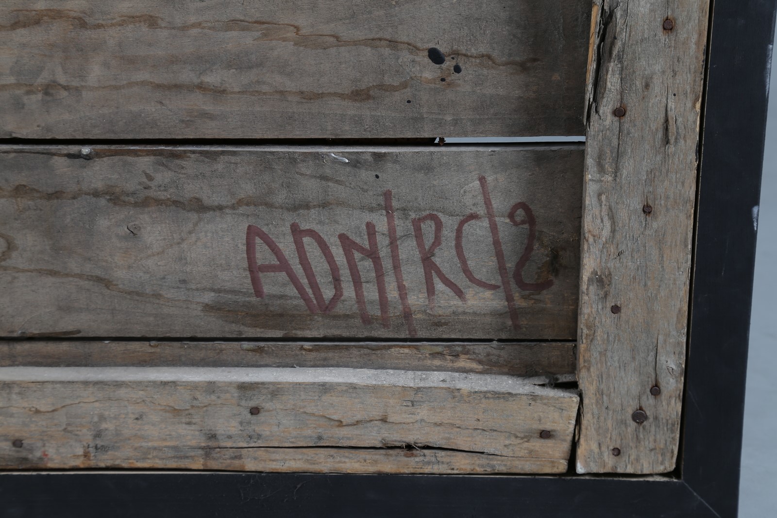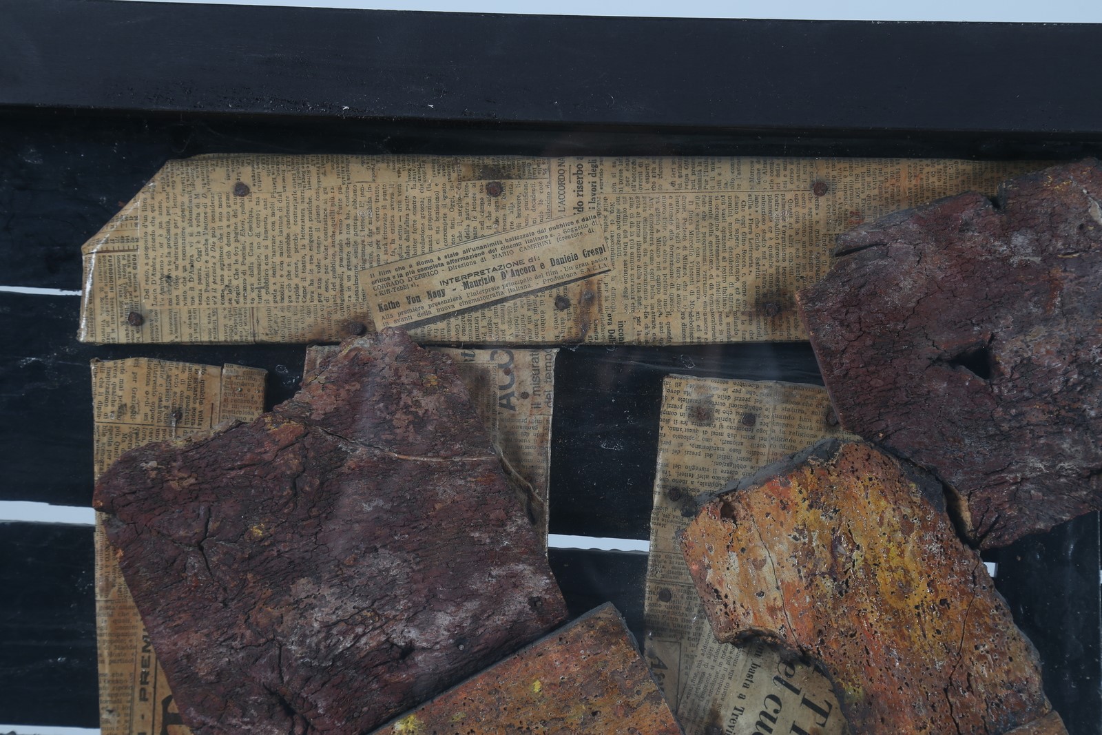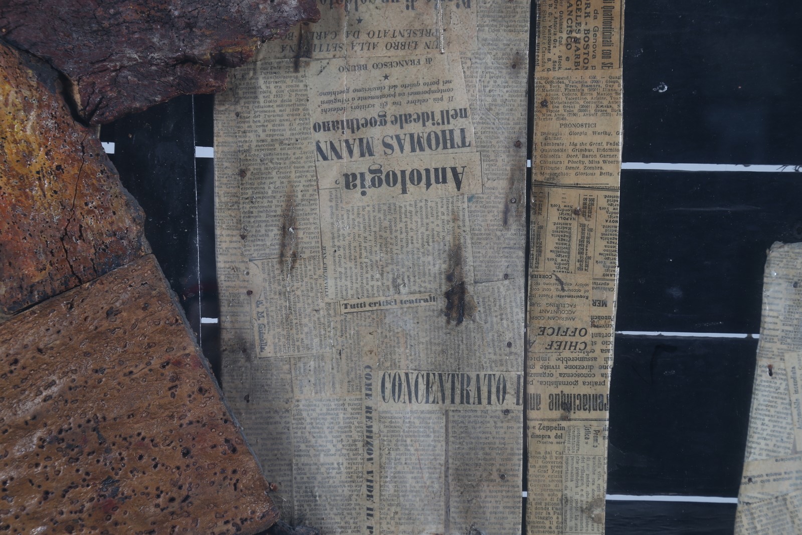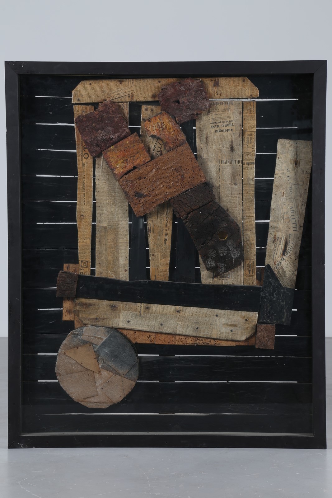 CRIPPA ROBERTO GAETANO (1921 - 1972) Untitled. 1963. Mixed nomes on board. Cm 138,00 x 113,00. At the back bears the inscription "1/il lavoro 2/la gabbia 3/il soldato (1/the work 2/the cage 3/the soldier)" and the Kasper Gallery Lousanne, stamp. Roberto Crippa Jr authenticity certificate on photo. Cornice presente