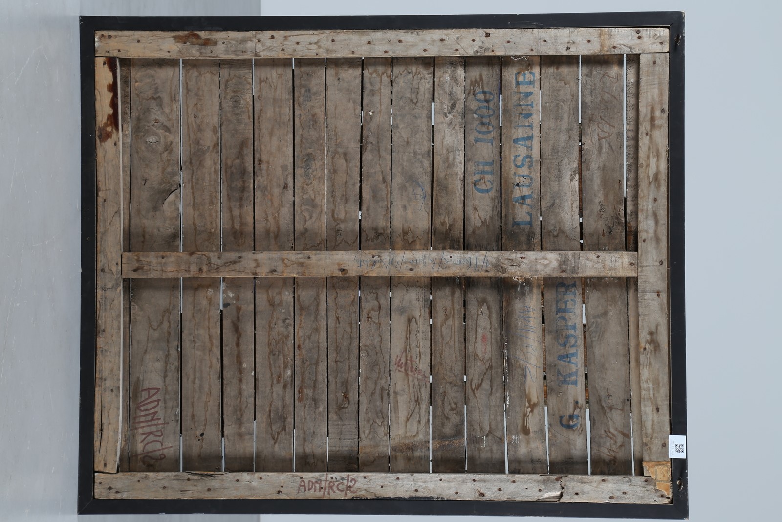 CRIPPA ROBERTO GAETANO (1921 - 1972) Senza titolo. . 1963. Tecnica mista su tavola. Cm 138,00 x 113,00. Al retro riporta la scritta: "1/il lavoro 2/la gabbia 3/il soldato" e il timbro della Galleria Kasper, Losanna. Autentica su fotografia a cura di Roberto Crippa Jr. Cornice presente