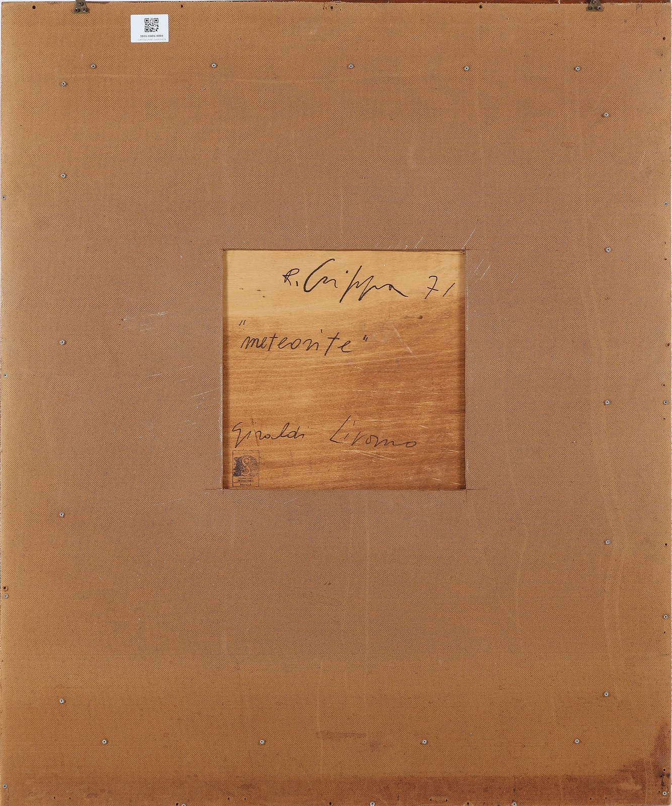 CRIPPA ROBERTO GAETANO (1921 - 1972) Meteorite. 1971. Mixed nomes on board. Cm 80,00 x 100,00. Signature, title and year at the back. Toberto Crippa Jr autenthicity certificate on photo. Cornice presente