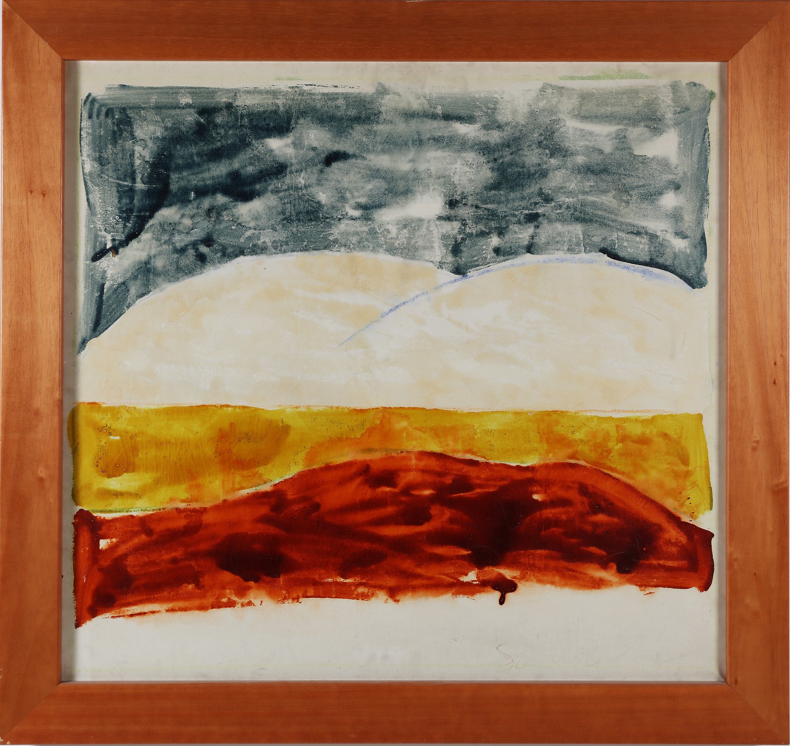 SCHIFANO MARIO (1934 - 1998) Senza titolo. . Smalti su tela. Cm 95,00 x 100,00. Firma in basso a destra. Al retro firma. Opera archiviata presso la Fondazione Mario Schifano, Roma, come da documentazione fotografica allegata all'opera datata 15 Marzo 2000, riportante il relativo numero d'inventario. Cornice presente