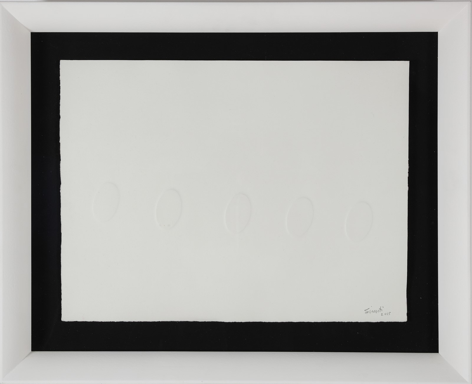 SIMETI TURI (n. 1929) 5 white ovals. 2015. Intaglio. Cm 52,00 x 38,00. Signed and dated lower right. Turi Simeti Archive, Milan, authenticity certificate on photo. Pubblication: Catalogo della Mostra Segnando Lo Spazio - Turi Simeti, tenuta dal 4/6/2015 al 4/9/2015 presso Albanese Arte, Matera. Cornice presente