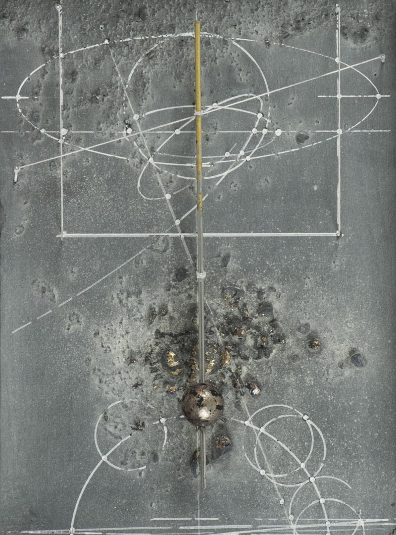 Walter Valentini Accadimento stellare 1999 Accumulazione e tecnica mista su tavola, cm. 30x22x5 , in teca di plexiglas Sul verso: firma, data, titolo ed etichetta dell'Artista con descrizione.