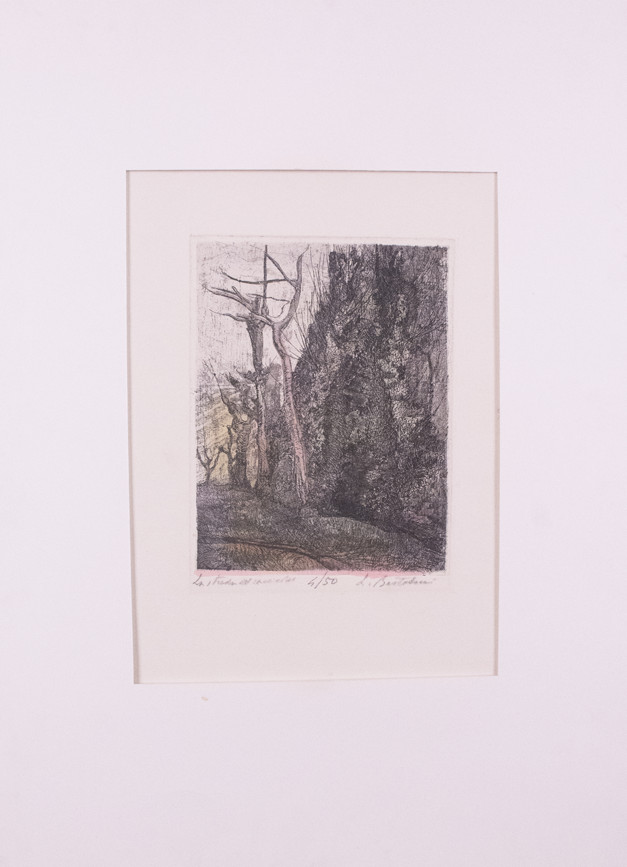 Luigi Bartolini (Cupramontana 1892 - Roma 1963), La strada del cacciatore, 1919 ca. Acquaforte acquarellata a mano, esemplare 4/50, 25 x 18,5 cm. Firma, titolo e tiratura in basso a matita. Provenienza: Galleria Marino, Roma.