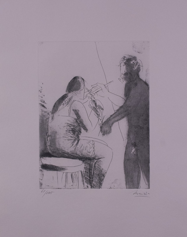 Giacomo Manzù (Bergamo 1908 - Roma 1991) Coppia al cavalletto, Abbraccio, Nudo di donna in piedi. 3 acqueforti e acquetinte su carta con firma dell'Artista in filigrana, esemplari 61/125, 50 x 65 cm