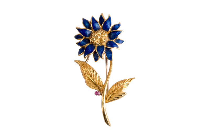Spilla fiore oro e smalti. Oro 8 Kti smalti blu. Peso gr. 7,30