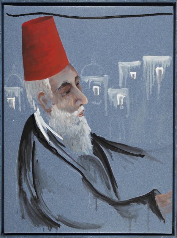 ALDO MONDINO (1938-2005) Filosofo, 2002 olio su linoleum cm 120x90 firmato, titolato e dedicato "per Tambur" sul retro Autentica dell'Archivio Mondino