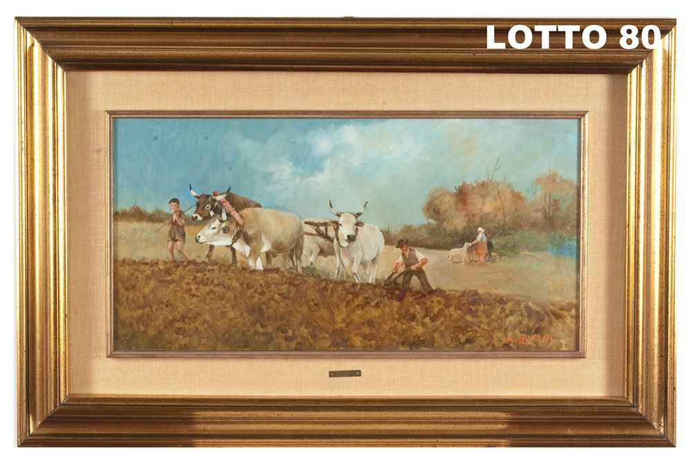ALFREDO SORESSI (1897 – 1982) STIMA 950,00 / 1.800,00 DIPINTO OLIO SU TAVOLA RAFF. SCENA AGRESTE MIS. 30 X 60 FIRMATO IN BASSO A DESTRA A RETRO CARTIGLIO “ACCADEMIA INTERNAZIONALE DI S. MARCO 2 MARZO 1971” E AUTENTICA DELL'ARTISTA DATATA 1965
