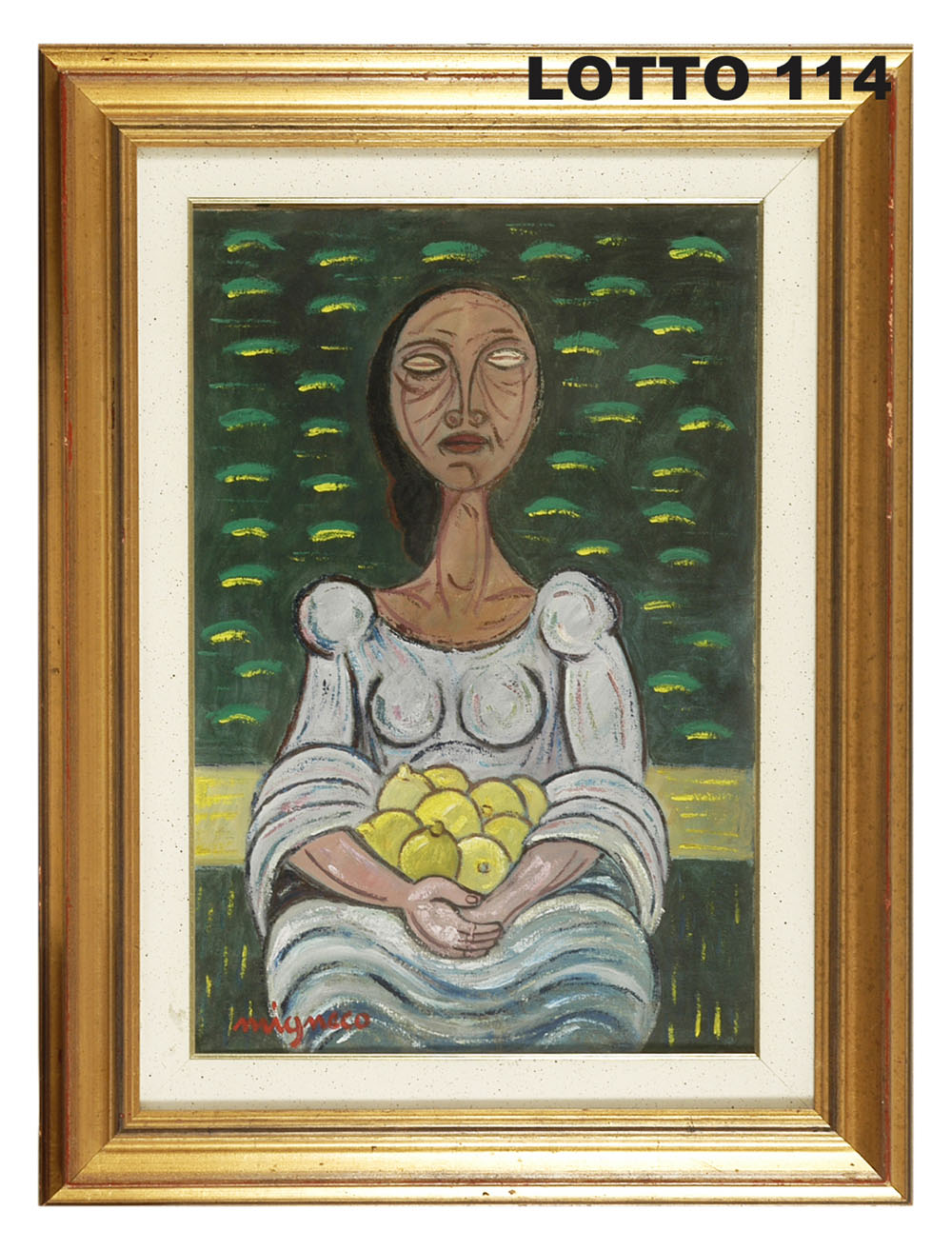 GIUSEPPE MIGNECO (1908 – 1997) STIMA 700,00 / 1.500,00 DIPINTO OLIO SU TELA RAFF. DONNA CON LIMONI MIS. 60 X 40 FIRMATO IN BASSO A SINISTRA A RETRO TIMBRO GALLERIA D'ARTE “LA SALETTA” LIVORNO