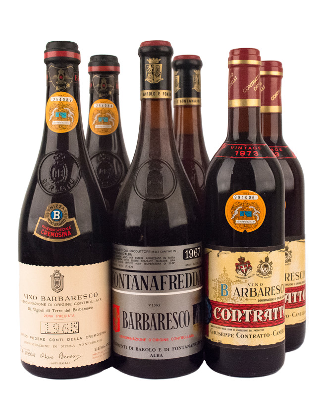 Barbaresco Selection ( Tot. 6 bt 0,75 lt.: 2 bt 1967 Fontanafredda, 2 bt 1973 Giuseppe Contratto, 2 bt 1965 Conti della Cremosina, Bersano )