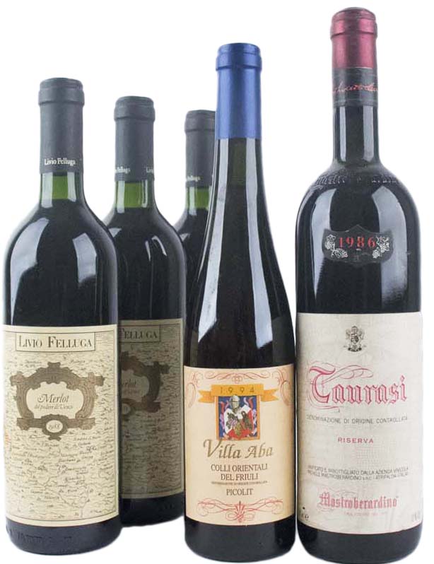 Italian Selection ( Tot. 5 bt. 0,75 lt.: 1 bt Taurasi Riserva 1986, Mastroberardino, 3 bt Merlot del Potere di Venco 1988, Livio Felluga, 1 bt Picolit Colli Orientali del Friuli 1994, Villa Alba ) 3 slightly damaged label / 3 etichetta leggermente rovinata