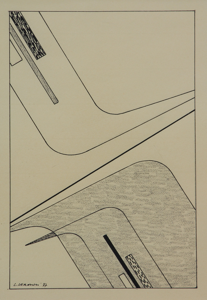 Luigi Veronesi, Senza titolo, 1977, tecnica mista su cartoncino, cm. 24x19, firmata e datata in basso a sinistra, opera esposta a Palazzo dei Diamanti di Ferrara nel 1978 come da etichetta al retro