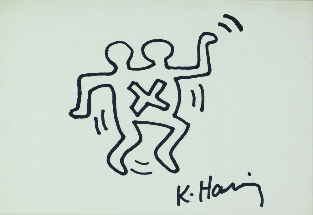 Keith Haring, Senza titolo (Omini), (1984), pennarello su carta, cm. 20x30, firmato in basso a destra, opera acquistata in occasione della presenza di Haring a Milano per una mostra a lui dedicata nel Giugno del 1984 (l'artista lo realizzò in quell'occasione)