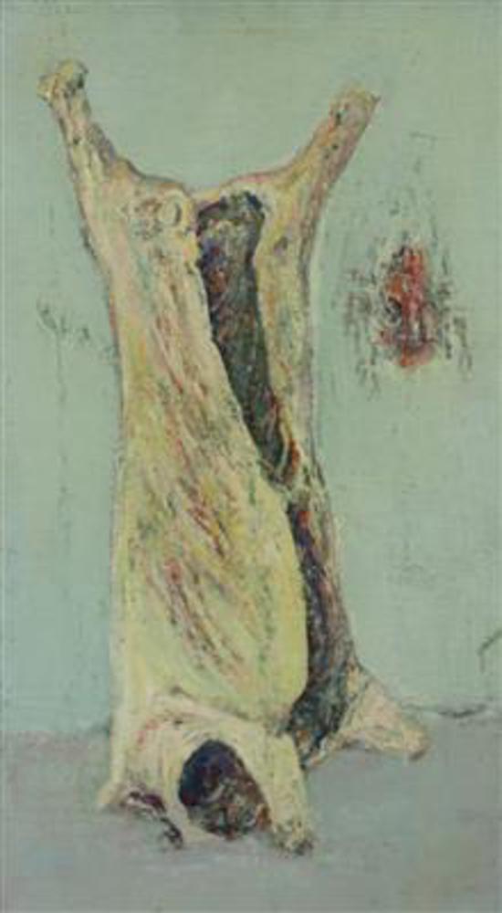 Renzo Vespignani, Manzo, 1951, olio su tavola, cm. 82x44,5, firmato in basso a destra, certificati di autenticità dell'artista su fotografia datati Agosto 1982