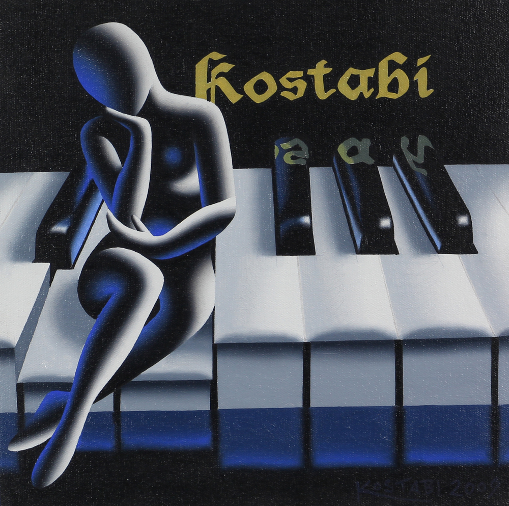 Mark Kostabi, In the Key of Kostabi, 2009, olio su tela, cm. 30x30, firmato e...