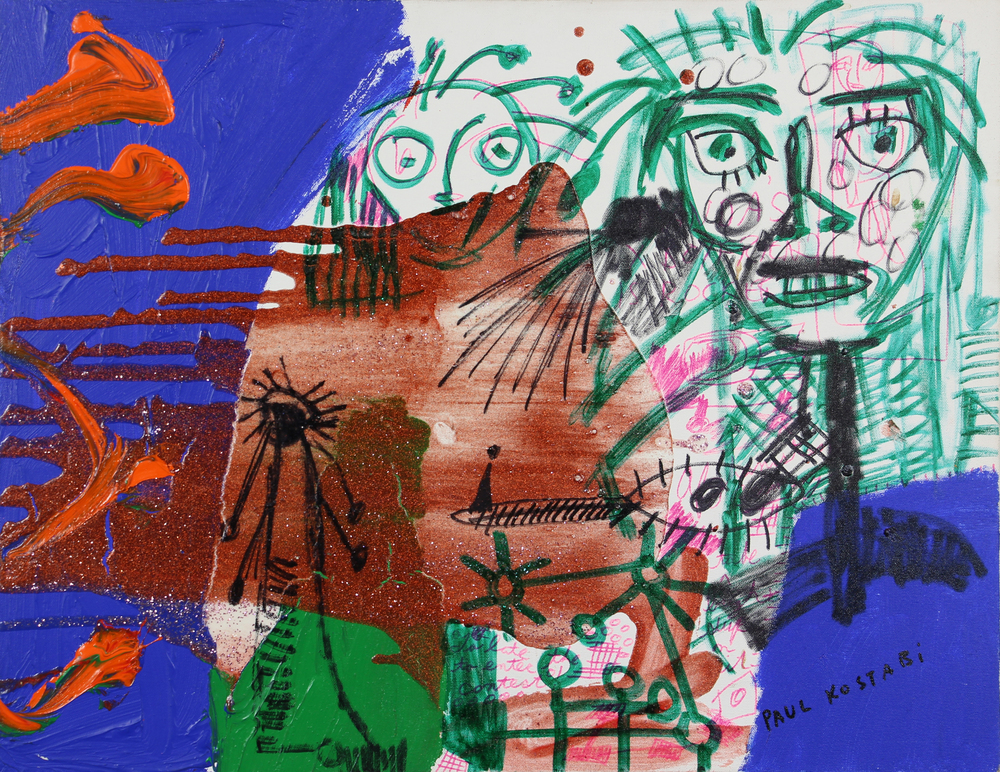 Paul Kostabi, Clod Hopper, 2007, tecnica mista e lustrini su tela, cm. 56x71, firmata in basso a destra, firmata, intitolata e datata al retro, certificato di autenticità dell'artista su fotografia, opera pubblicata sul catalogo della mostra "Paul Kostabi" tenutasi presso la Saletta d'Arte Viviani di Pisa dal 1 al 31 dicembre 2007 a pag. 45, provenienza Casa d'Aste Semenzato di Venezia, senza cornice