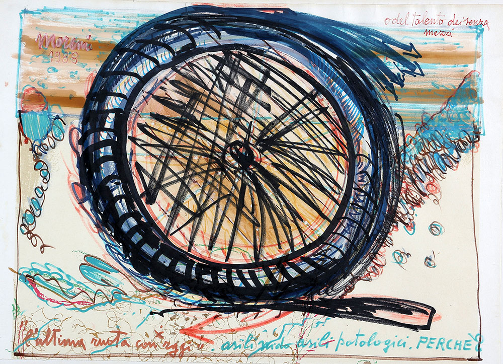 MATTIA MORENI 1920 - 1999 L’ultima ruota con raggi, asili nido asili patologici. Perché?, 1988 Tecnica mista su carta, cm. 50 x 69 Firmato e datato in alto a sinistra Prov. Collezione Privata