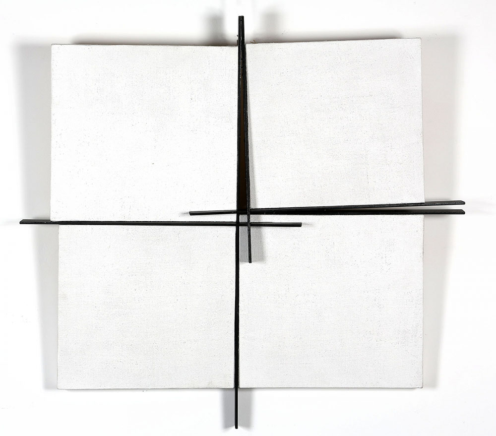 GIOVANNI CAMPUS 1929 Tempo in processo. Rapporti misure connessioni, cm. 2015 Acrilico su tela, legno sagomato e smalto su ferro, cm. 83 x 88 x 7,5 Firmato e datato sul retro Prov. Collezione Privata