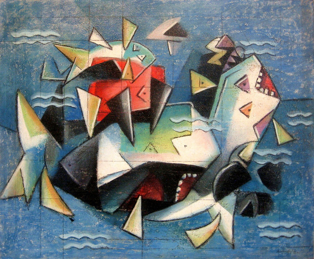 IBRAHIM KODRA 1918 - 2006 Lotta di squali, 1976 Tecnica mista su tela, cm. 60 x 73 Firmato e datato sul retro Autentica Fondazione Kodra Milano su fotografia Prov. Collezione Privata