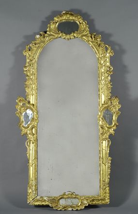 Specchiera in legno dorato e intagliato, con inserti a cartocci e specchi,...