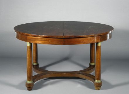 Tavolo ovale allungabile in mogano, su gambe a colonna con capitelli in metallo dorato riunite da traversa, XIX sec., cm. 73x114x129.
