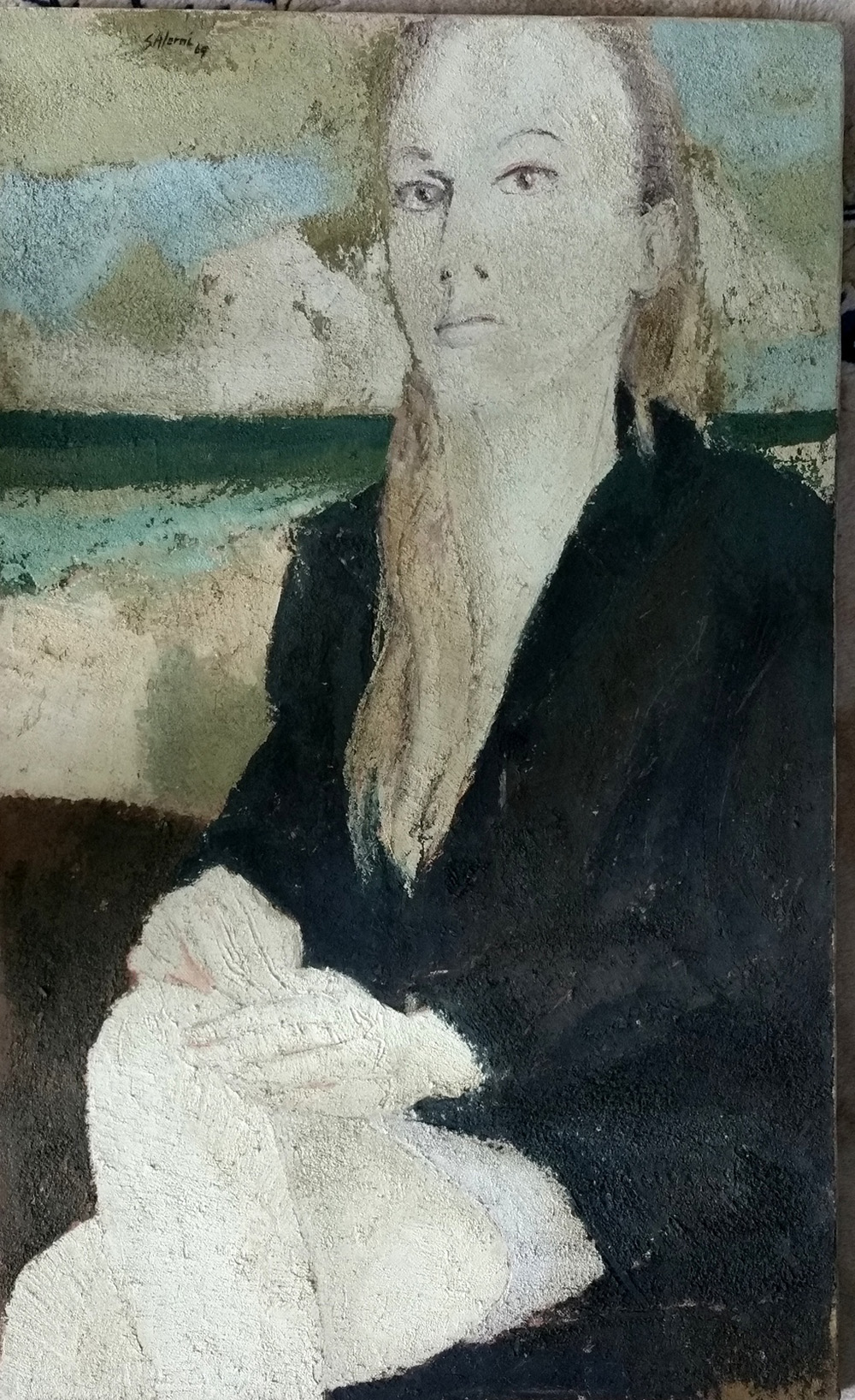 Enzo Salerni "Figura seduta" 1969 - Olio e sabbia su tela - cm 83x50 - Firma in alto a sx - Autentica e provenienza Galleria Accademia TO