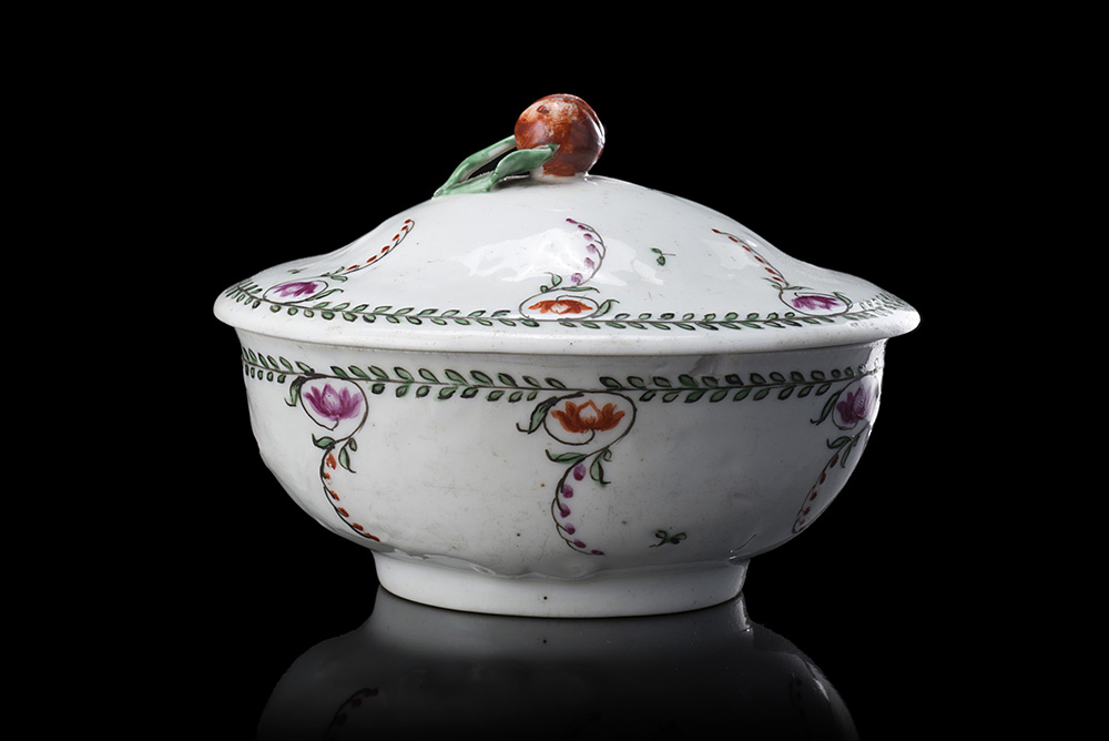Zuccheriera in maiolica con decorazione a festone vegetale e piccole rose (h. cm 9,5 x 11) Sotto al piede e allíinterno del coperchio numerale 23 in rosso ferro. Sec. XVIII/XIX Majolica sugar bowl. 18th/19th century