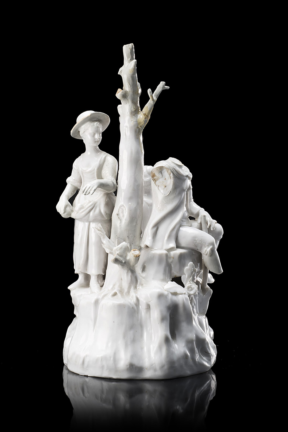 Gruppo plastico in porcellana bianca raffigurante tre contadini ed un albero senza fronde (h. cm 20) Sec. XVIII (rotture e mancanze) 18th-century porcelain group depicting three peasants (losses)