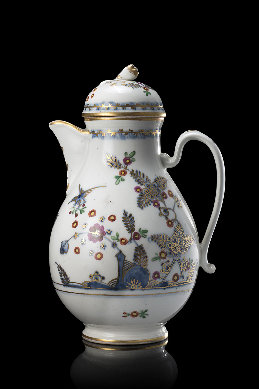 Caffettiera in porcellana con decoro a fiori orientali e rialzi in oro sul disegno in blu. Manico a voluta e coperchio con presa a frutto (h. cm 23) Marca di fabbrica e numero con punto. Vienna, sec. XVIII (felature e restauri) Porcelain coffee pot. Vienna, 18th century (hairlines and restorations)