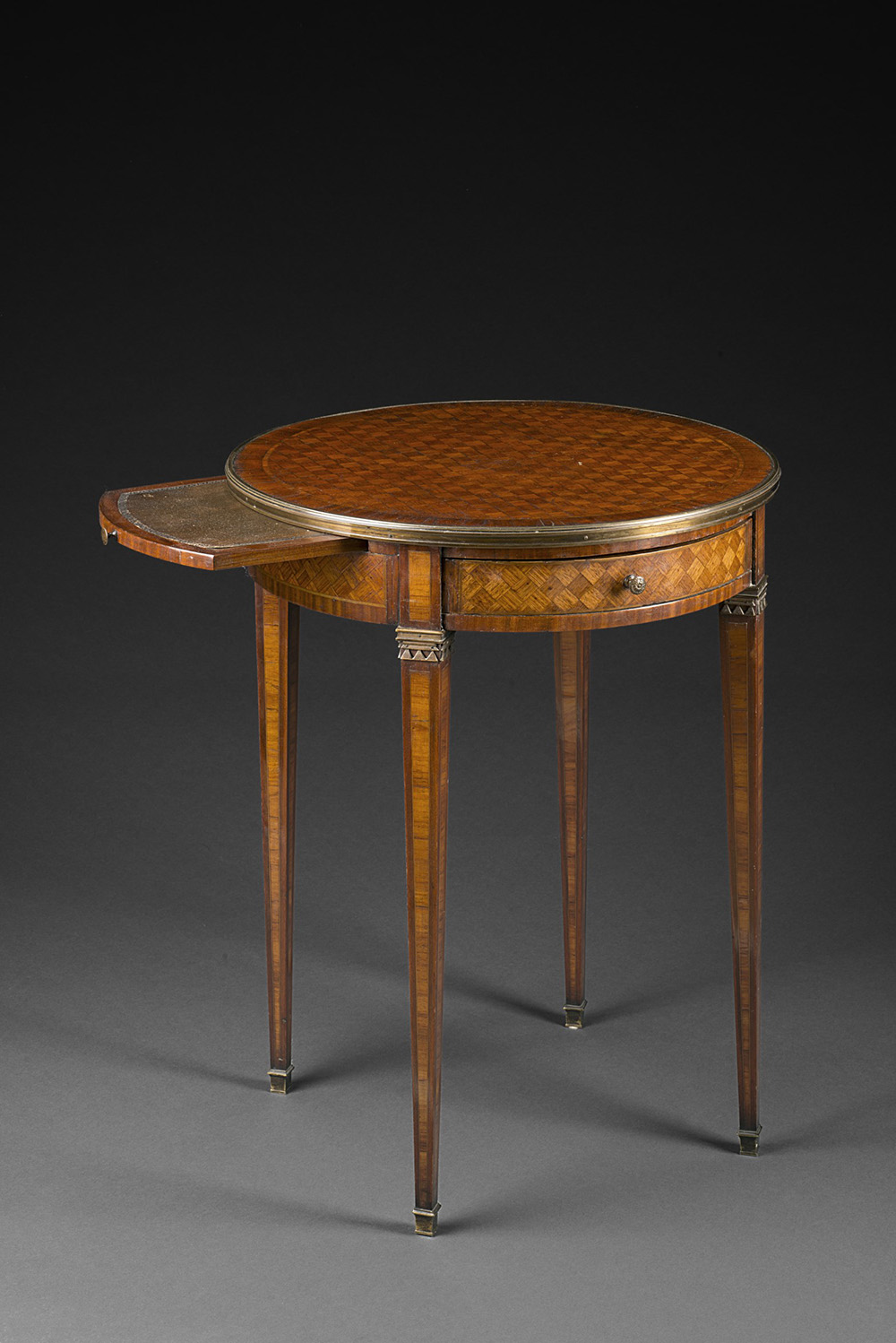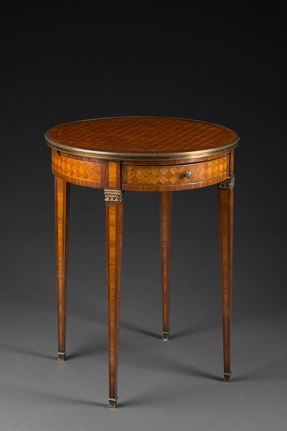 Tavolino tondo lastronato a marquetterie in legni vari, piano incorniciato in ottone, cassetto nella fascia con etichetta "Harrods London" e numero d'inventario. Gambe rastremate con capitelli e piedini in bronzo. Terz'ultimo quarto del sec. XIX (d. cm 56x h. cm 75) Late 19th-century wood and marquetry table