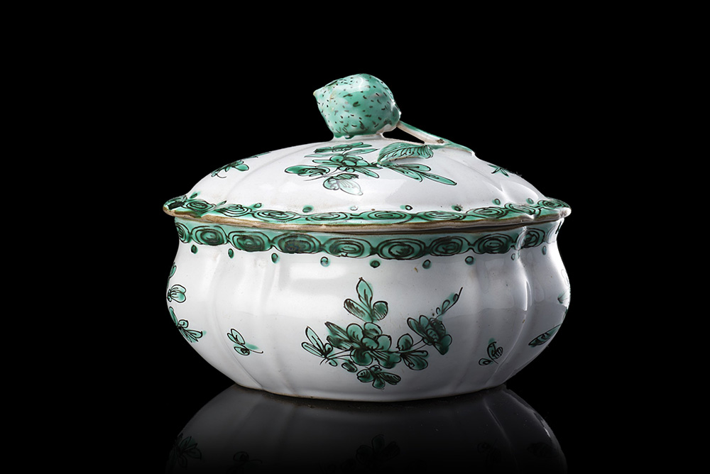 Zuccheriera in maiolica con decoro a mazzetti di fiori in verde Savy contornati in bruno. Allíinterno del coperchio Ë presente ëxí in bruno (h. cm 9,5) Milano, seconda met‡ del sec. XVIII Majolica sugar bowl. Milan, second half of the 18th century