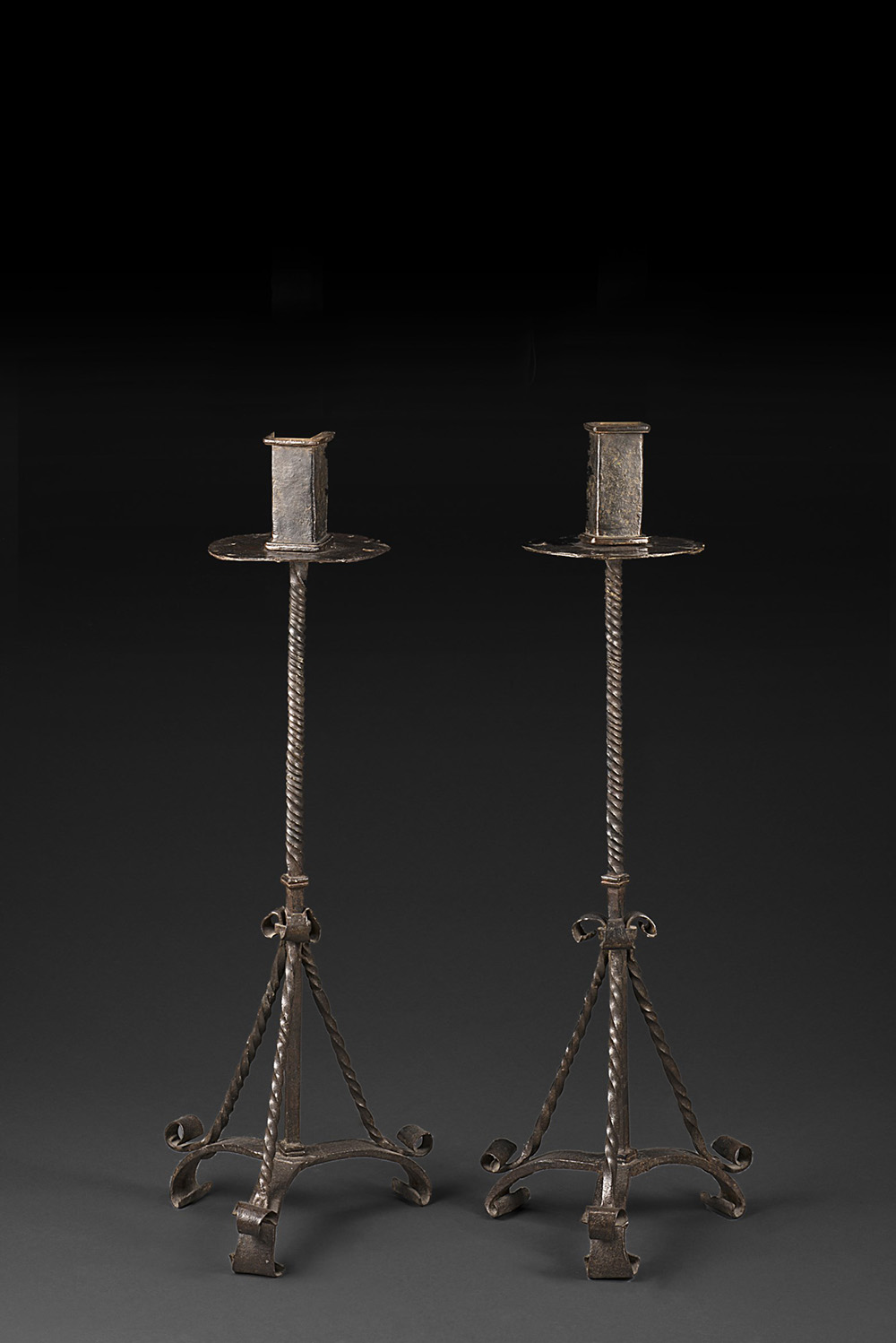 Coppia di antichi portaceri in ferro battuto con montante a torciglione; base...
