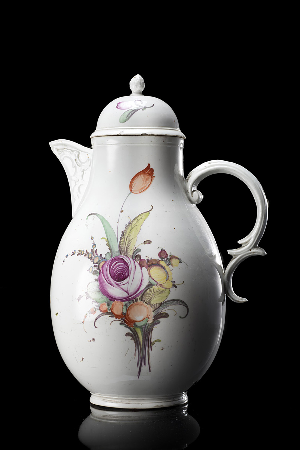 Caffettiera in porcellana con decori a mazzi di fiori. Beccuccio versatore modellato a rilievo con riserva rococÚ. Manico a doppia voluta. Marca di fabbrica incussa e con numero 77. Nymphenburg, sec. XVIII/XIX (sbeccature) Porcelain coffee pot. Nymphenburg, 18th/19th century (chipping)