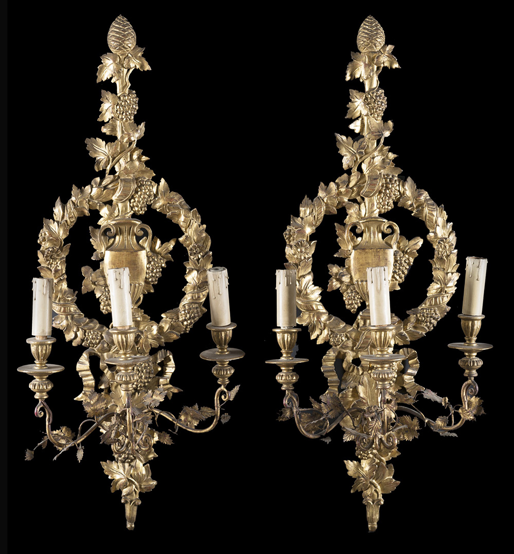 Coppia di appliques in legno intagliato e dorato sormontate da elemento a forma di pigna, parte centrale con vaso tra foglie di vite e fiori da cui dipartono tre bracci in metallo dorato e porta-candele in legno (cm h 95) Fine sec. XIX (lievi difetti) A pair of carved giltwood wall lights. Late 19th century (minor defects)