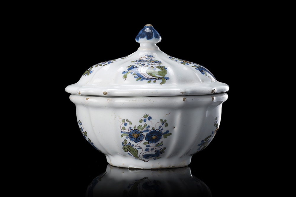 Zuccheriera sagomata e costolata in maiolica con decoro rocaille a fiori con radici ricurve (h. cm 11,5) Sec. XVIII (sbeccature) 18th-century majolica sugar bowl (chipping)