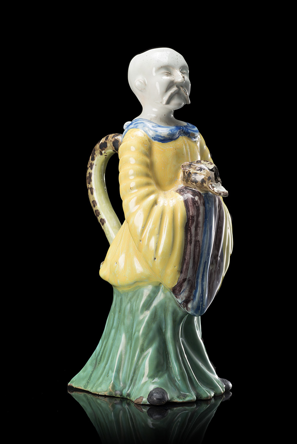 Versatoio in maiolica policroma modellato in figura di cinese. Manico a...